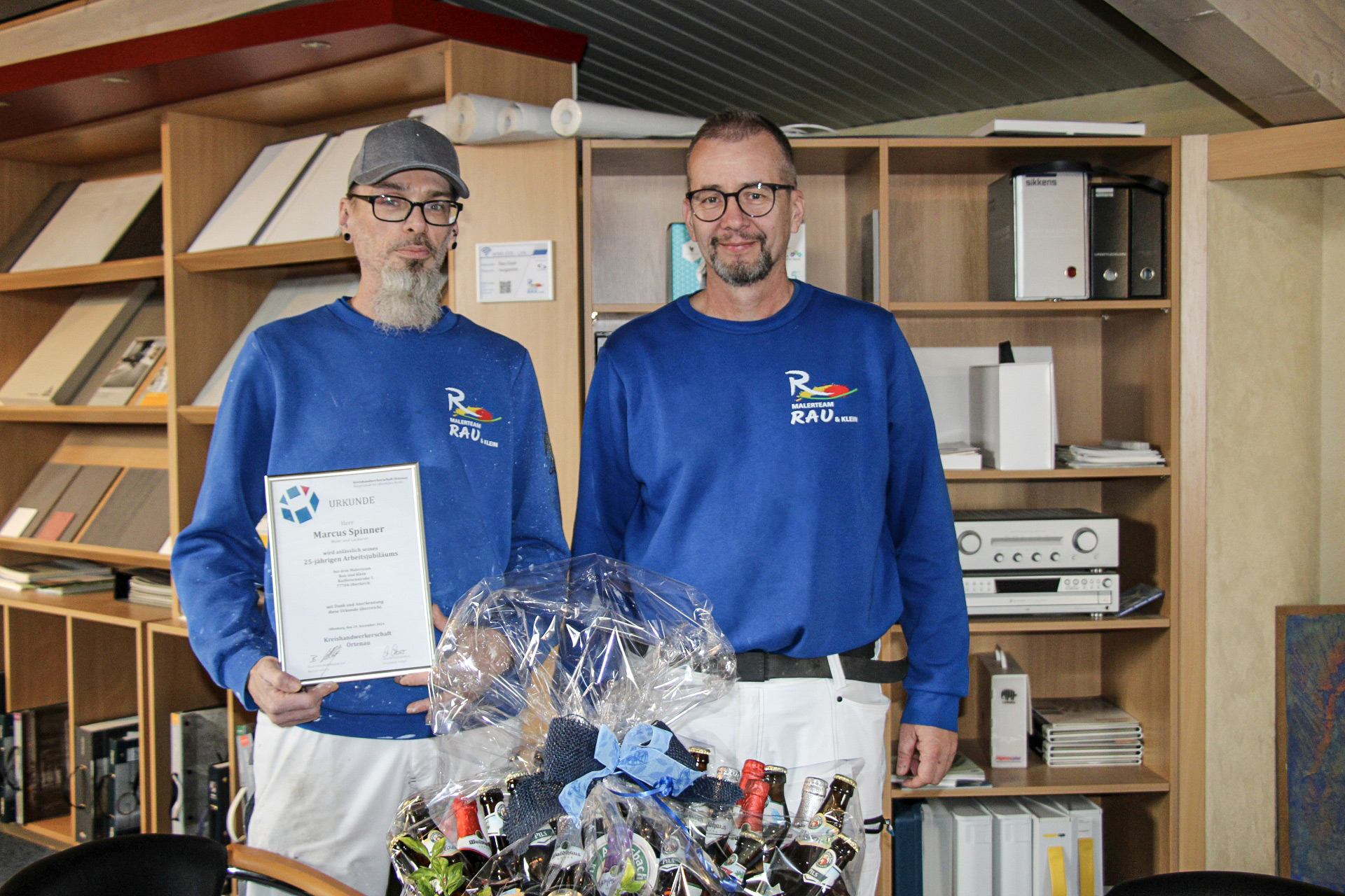 Oberkirch (rv). Anlässlich seines 25-jährigen Arbeitsjubiläums wurde Marcus Spinner von der Kreishandwerkerschaft Ortenau mit der Dank- und Anerkennungsurkunde ausgezeichnet, die ihm sein Chef, Malermeister Stefan Rau, überreichte. Spinner kam als Geselle des Maler- und Lackierhandwerks zum Malerfachbetrieb Raymond Klein und ist nach der Übernahme des Malerfachbetriebs Klein am 1. Januar 2021 zum Malerteam Rau & Klein GmbH mitübernommen worden. Marcus Spinner ist bei den Kunden sehr beiiebt, ein zuverlässiger und kollegialer Mitarbeiter im zehnköpfigen Malerteam und verfügt über ein breites, berufliches Fachwissen.