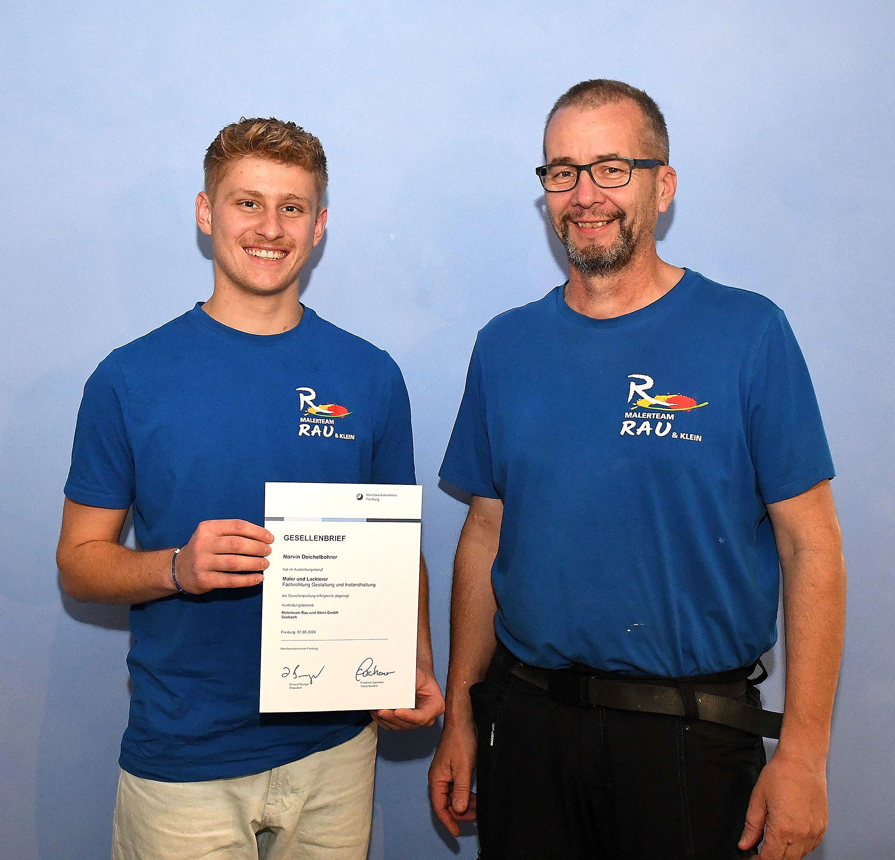 Maler- und Lackiererprüfung ab, Firmenchef Stefan Rau freut sich mit ihm darüber.